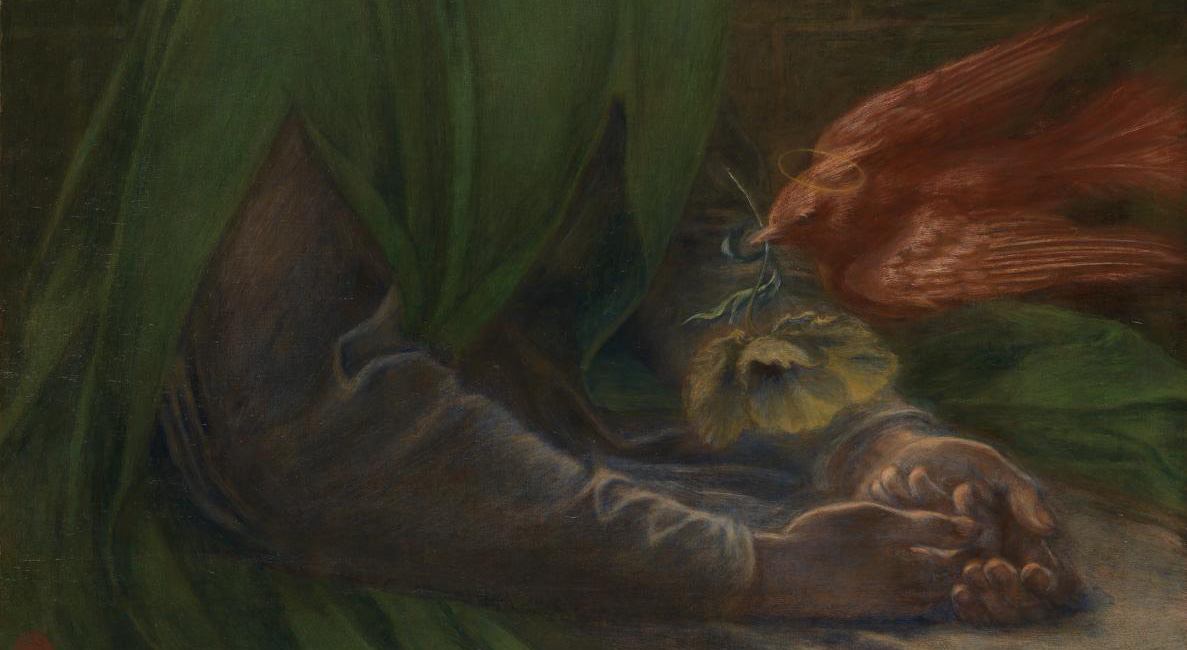 L’oiseau est en réalité une colombe (qui a un peu forcé sur la teinture rouge, je vous l’accorde) puisque Rossetti surnommait son aimée « ma colombe ». Pas terrible, mais c’est toujours mieux que « ma pintade ». Elle symbolise aussi le Saint Esprit.
