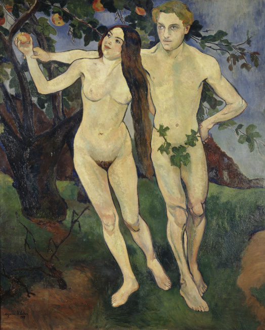 Déjà que leur relation faisait du bruit dès ses débuts puisque Suzanne est plus âgée que lui et qu’elle est mariée, mais avec ce tableau, elle n’hésite pas à afficher leur amour au grand jour ! Leur pose est détendue, le bras de Valadon passant dans le dos d’André pour entrelacer sa main à la sienne. Lui, de sa main gauche, saisit le poignet de Suzanne-Ève, annulant ainsi la notion de « pécheresse » en se mettant sur un pied d’égalité avec elle. D’ailleurs, de par l’impression de quiétude et d’amour qui se dégage de l’ensemble, la notion de péché, tant de fois martelée durant des siècles, en est totalement absente. Suzanne célèbre ici leur amour au grand jour et leur liberté de s’aimer, l’éloignant ainsi du péché et de toutes les critiques qui peuvent l’accompagner. On notera également la présence de poils sur le pubis de Suzanne, du jamais vu dans une représentation d’Ève et un choix de représentation encore trop rare en ce début de XXe siècle.