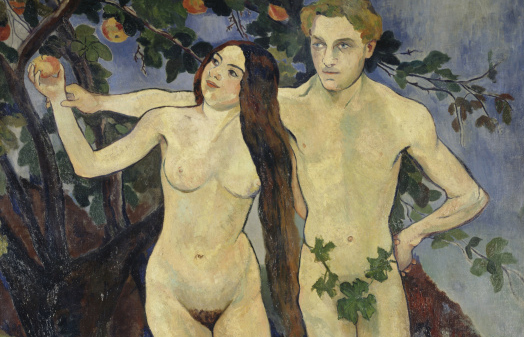 Déjà que leur relation faisait du bruit dès ses débuts puisque Suzanne est plus âgée que lui et qu’elle est mariée, mais avec ce tableau, elle n’hésite pas à afficher leur amour au grand jour ! Leur pose est détendue, le bras de Valadon passant dans le dos d’André pour entrelacer sa main à la sienne. Lui, de sa main gauche, saisit le poignet de Suzanne-Ève, annulant ainsi la notion de « pécheresse » en se mettant sur un pied d’égalité avec elle. D’ailleurs, de par l’impression de quiétude et d’amour qui se dégage de l’ensemble, la notion de péché, tant de fois martelée durant des siècles, en est totalement absente. Suzanne célèbre ici leur amour au grand jour et leur liberté de s’aimer, l’éloignant ainsi du péché et de toutes les critiques qui peuvent l’accompagner. On notera également la présence de poils sur le pubis de Suzanne, du jamais vu dans une représentation d’Ève et un choix de représentation encore trop rare en ce début de XXe siècle.